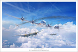 Designed as a long range bomber, the B-29 Superfortress was one of the most expensive projects for the United States in World War II exceeding even the Manhattan Project in cost. The B-29 was advanced featuring a pressurized fuselage and remote, computer controlled fire control system for the four defensive turrets. B-29 raids devastated Japan during the final years of the war most notoriously dropping the atomic bombs on Hiroshima and Nagasaki. This print features B-29 "Million Dollar Baby" with P-38 Lightning escorts during a mission to bomb Iwo Jima in December of 1944.